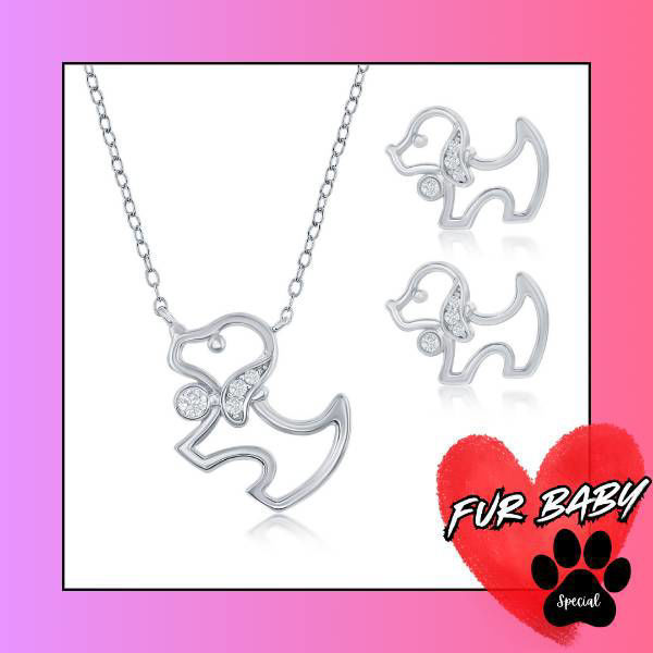 925 Sterling Silver Genuine White Topaz Puppy Pendant & Earring Set.