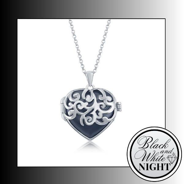 325 Triple Rhodium Finished Italian Sterling Silver Genuine Black Agate Filigree Heart Locket with Chain.