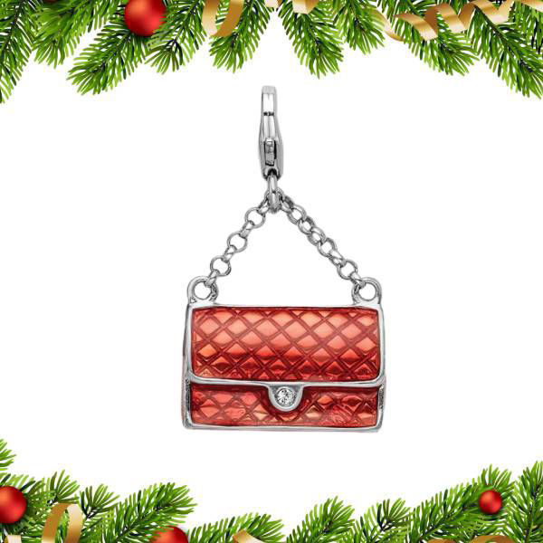 925 Rhodium & Enamel Finished Sterling Silver Quilted Crystal Accented Handbag Charm.