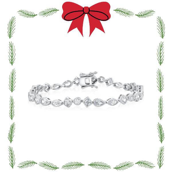 This is a great twist on an already hot design. A Bezel set tennis bracelet is a stunning piece of jewelry that effortlessly combines modern elegance and sophistication in a timeless design. This piece is Crafted from sterling silver with a triple rhodium finish, it boasts a lustrous shine that enhances its luxurious appeal. The bracelet features 14.50 carat total weight of multi-shaped, bezel-set lab-grown white sapphires, including Pear, princess, round and marquise offering a dazzling display of brilliance. At 7.5 inches in length, it elegantly encircles the wrist, making it a perfect choice for both everyday wear and special occasions. This piece is a testament to the beauty of modern craftsmanship, taking an old design and making it new again. This bracelet will provide a chic and timeless addition to any jewelry collection.