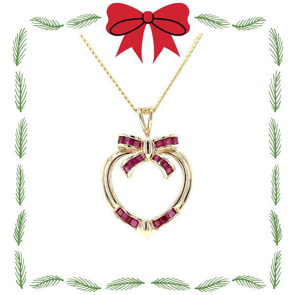 This exquisite blast from the past is a stunning combination of elegance and charm, just in time for the holidays, bow included. This heart shaped pendant is set with 18 genuine princess-cut rubies, renowned for their deep red hue and brilliance, combined they weigh a little over .50 carat. The rubies are meticulously set in a channel creating an adorable bow design at the top and a gorgeous accent at the bottom This heart is solid 14 karat yellow gold, adding a touch of warmth and luxury to the piece. The pendant hangs gracefully from a gold-plated sterling silver chain, adding a touch of beauty without adding to the price. This vintage ruby pendant is from the 1960's and looks like brand-new.