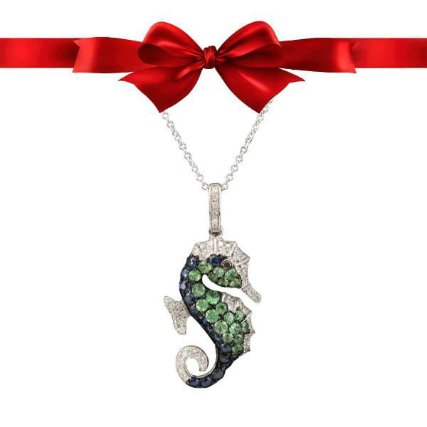 14kt. White Gold 1.33ctw. Tsavorite Garnet, Blue Sapphire, Black & White Diamond Seahorse by EFFY