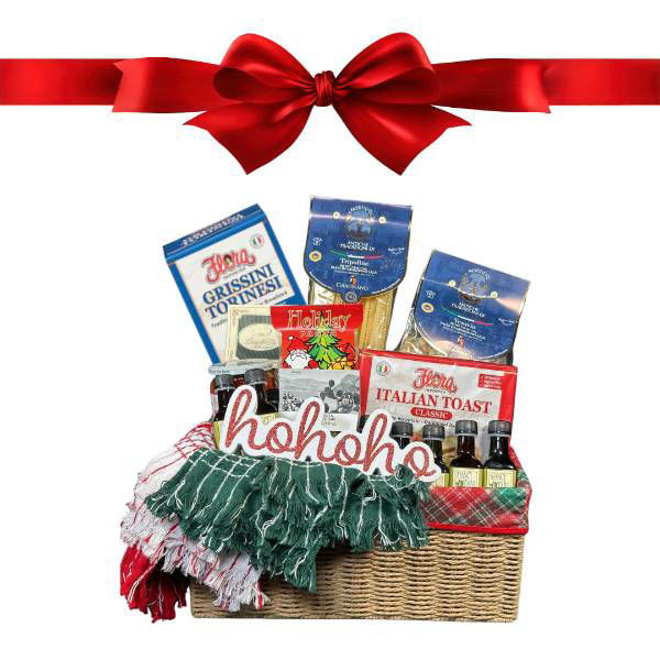 Italian Holiday Gift Basket Set of 3 Kitchen Towels 14 oz. Holiday Pasta 24 oz. Mariana Sauce 8.8 oz. Biscotti 11.5 oz. Italian Toast 4 - 100ml Gourmet EVO 4 - 100ml Gourmet BV & more