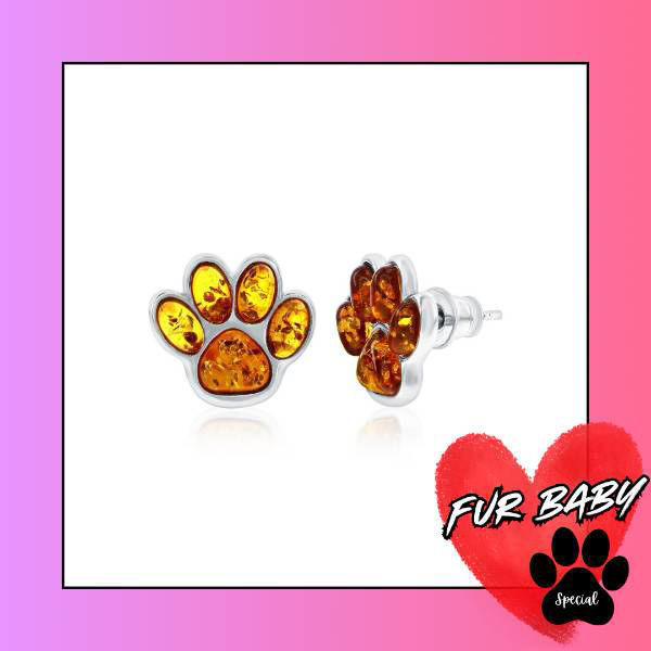 925 Sterling Silver Genuine Amber Paw Print Stud Earrings.