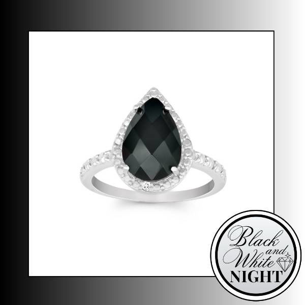 925 Triple Rhodium Finished Italian Sterling Silver Genuine Faceted Black Onyx & White Sapphire Ring.