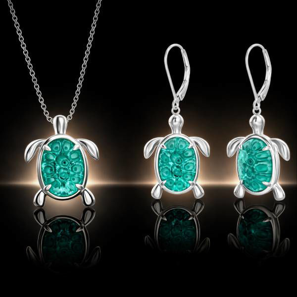 925 Rhodium Finished Sterling Silver Genuine Murano Glass Turtle Pendant & Earring Set
