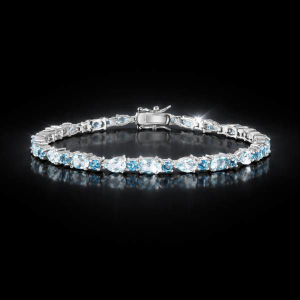 This 925 sterling silver bracelet features a rhodium (platinum-like) finish and is adorned with genuine Swiss Blue Topaz and Sky Blue Topaz gemstones totaling 12.24 carats, set in elegant oval and pear shapes, measuring 7.25 inches in length with a secure clasp, designed in a classic gemstone tennis style that beautifully captures the brilliance of blue skies and sparkling water.