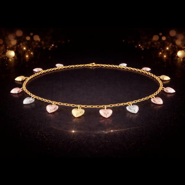 • 14 KT. Solid Gold • White, Yellow & Rose Gold • Diamond-Cut Finish for Added Sparkle • Dangling Heart Design • 7.25" Length • Secure Clasp Closure A timeless piece that blends romance, shine, and sophistication—perfect for gifting or treating yourself.